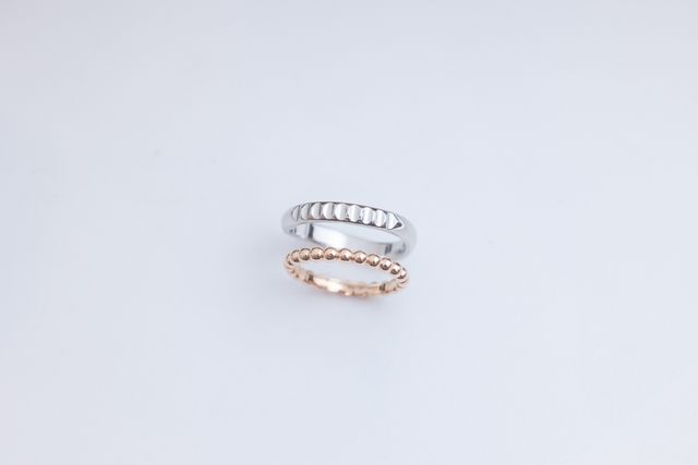 素材からデザインまで、可能な範囲で好みのデザインに仕上げていただきました。私の指輪については、片面は丸型でくり抜いたような模様を施し、もう片面は槌目をつけカーブさせており、リバーシブルでどちらも楽しめるような指輪にしていただきました。妻の指輪ついては、くり抜いた模様にはまるサイズで球体が連なったリングを作成いただきました。