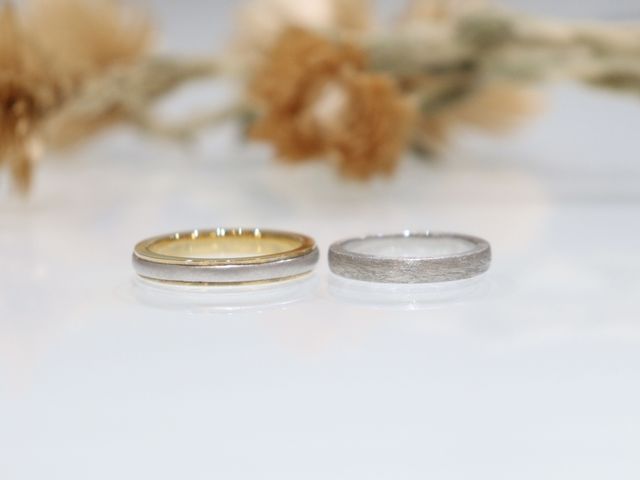 結婚指輪のデザインはお揃いじゃないといけないと勝手に思っていた部分があったのですが、最近は男女別々のデザインをつけることも珍しくないと知りました。お互い自分が気に入ったデザインを選んで、とても満足しています。少しだけ統一感がでるように、どちらのデザインも表面加工がされているものにしたのがポイントです。