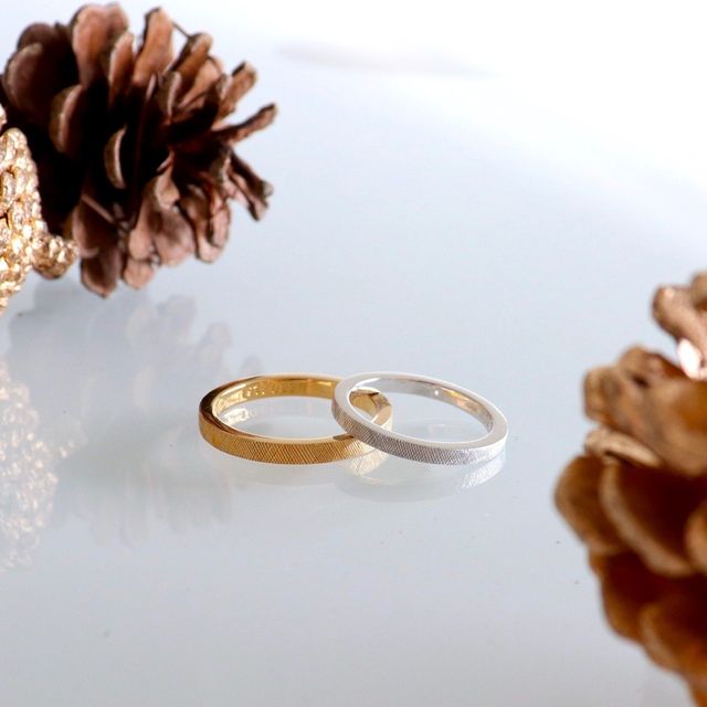 シンプルながらも繊細な彫り模様が素敵だったので選びました。指輪の色も好みで自由に選べるので、色を一緒にするか悩みましたが、お互いの好きな色で作ることにしました。実際に付けた時の雰囲気もお互いの指にしっくりきているので満足です。
