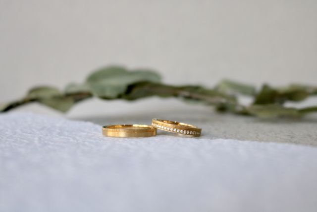 オーダーならではなのデザインがいいと思っていて、そしたらこちらのリングを提案していただきました。ゴールドのリングにダイヤが散りばめられていて品の良さがとても気に入っています。旦那のリングはぱっと見は普通のリングですが、近くで見るとリングの表面がデザインされていて、特別感があって気に入っています。