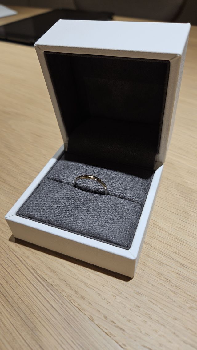 デザインのシンプルで普段使いができそうなところ、色味が気に入りました。つけ心地も悪くありません。ペアで着けた時の親和性もあると思います。重さは気になりません。照明に当てた際のかがやきが印象的で満足しています。