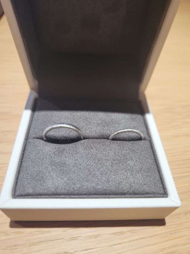 ほかの指輪ではあまり見ないデザインで、女性用だけダイヤがついていたりせず、男性用女性用が全く同じデザインなのが気に入りました。