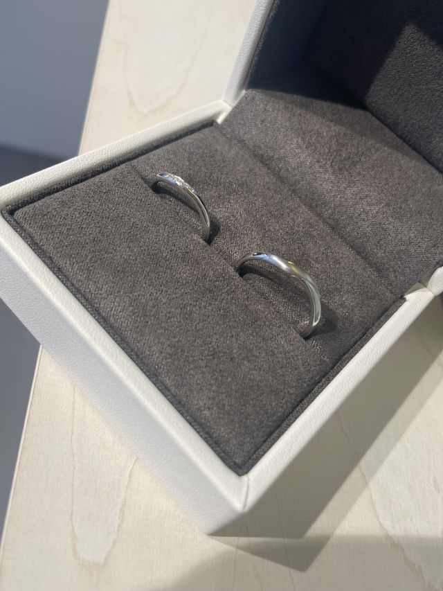 シンプルながらも少し個性の目立つデザインにしました。密に埋まっているダイヤも素敵です。実際ペアのものではありませんが、同じブランドの似ているデザインを選択しました。何よりそれぞれが一目惚れしたものなのでお気に入りです。