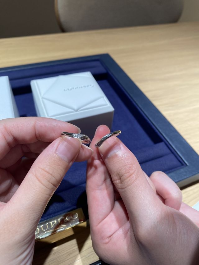 ビジュピコさんには、とても多くのブランドが並んでいたため、最後の最後まで悩んでしまったのですが、担当の方に聞いて、キューティーな感じよりも、綺麗な感じが似合うということで、こちらのブランドを選ばせて頂きました!その時ときめくものというより、この先自分に似合う物という選び方をしたため、装着時に指がスッキリ細く見えるような感じでとても気に入っています!