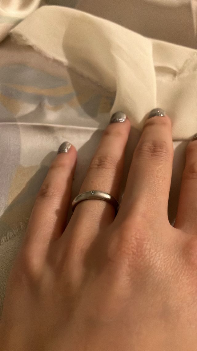 指輪を購入する上で、一番大事にしたのは毎日つけられること、また温泉など旅行の際にもつけていけることです。材質は扱いやすいプラチナを選びました。また、デザインは、綺麗な服を着ている時も、古着などのカジュアルな服を着ている時も、どちらもしっくりくるように、自然なうねりのあるデザインで、少しマットな「シルク」磨きにしてもらいました。