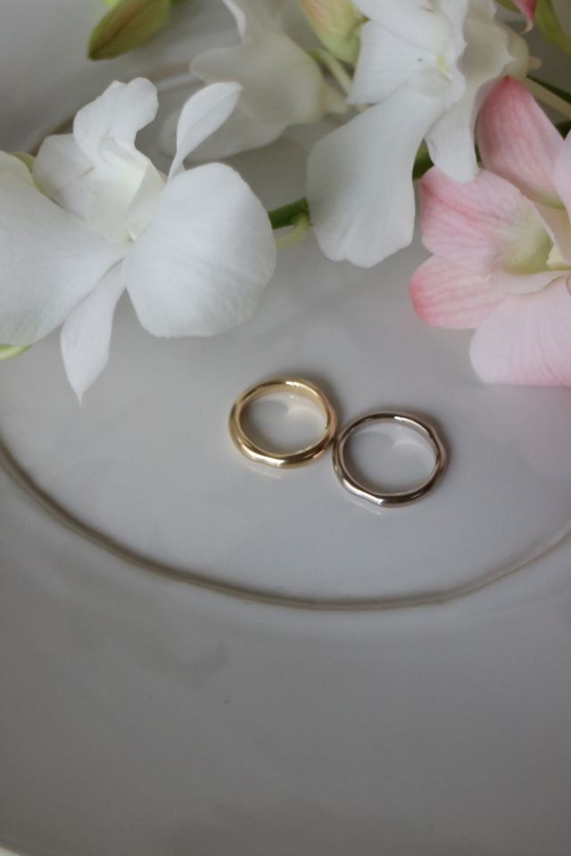 金属の素材や質感デザインをたくさんの中から選ぶことができ、いくつも試着させていただいて決めました。少し太めの指輪ですが付け心地も良く、普段アクセサリーを全くつけない彼も、指輪が届いてからは違和感なくずっとつけられているそうです!湾曲している部分があるので指輪のイメージも違って見せることもでき、後々石を追加したりすることもできるのでアレンジも楽しめそうです。