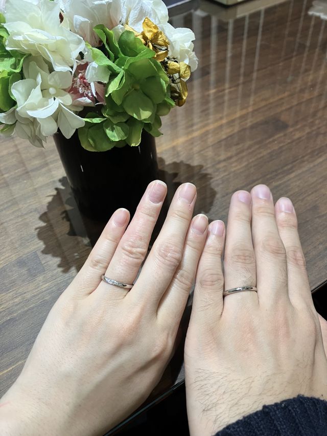 シンプルなリングより少しデザインが欲しいけど、あまりシャープな印象のものは避けたかったので、丸みのある印象のまま波打ったようなデザインが入ってる「宮」を選びました。指先側や付け根側から見てもダイヤがよく見えるデザインが個性的で気に入りました。