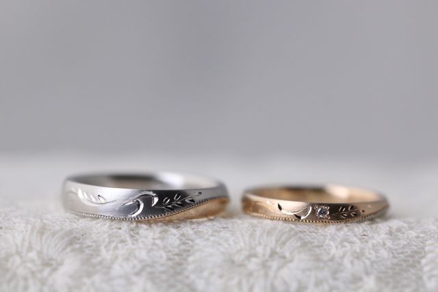 ハワイアンジュエリー風にデザインしてもらいました。お互いリングの素材は違うものを選んだので、相手の素材を少しリングに取り入れ、彫りのデザインも私達だけの意味があるものを彫って頂きました。他にはない特別なオリジナルのデザインリングにして頂きました。