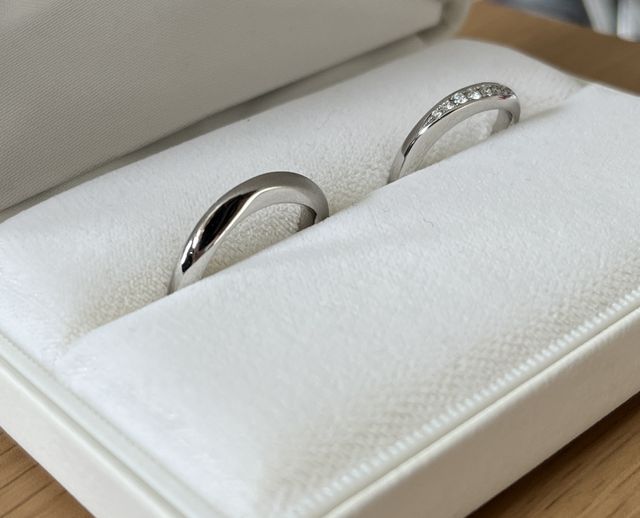 ウェーブデザインにして、正面に見える面に小さいダイヤを並べました。シンプルなデザインですが、ダイヤがキラキラするのが、結構遠目からでも気付いてもらえるのが嬉しいです。素材はプラチナ (Pt900)です。