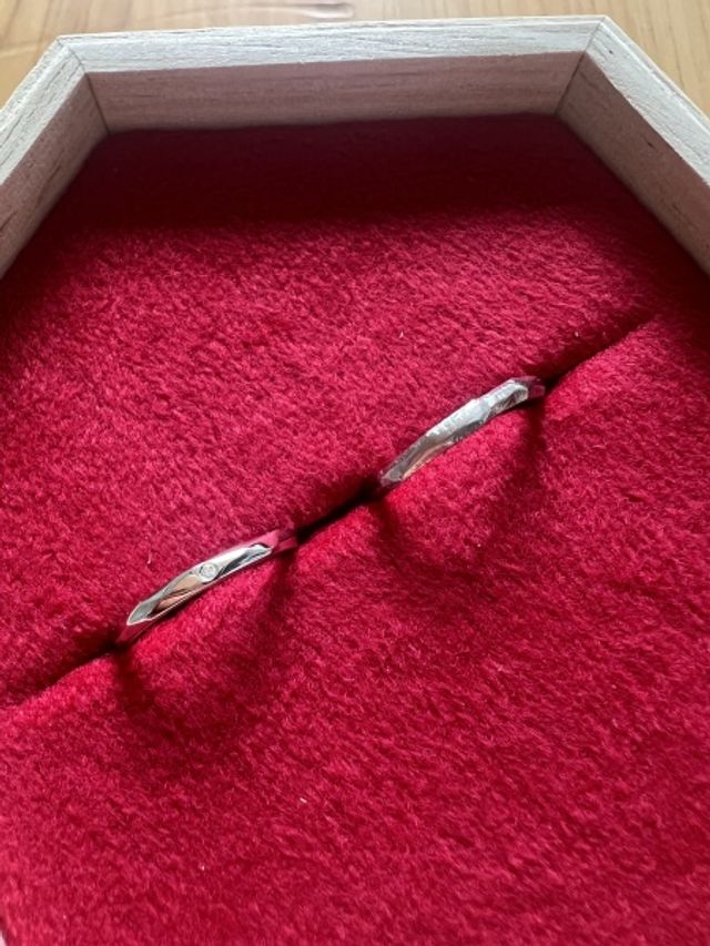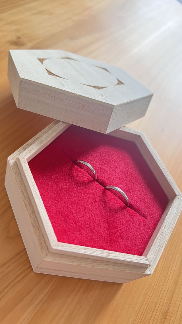 デザインは甲丸 / 平打ち / ヤスリ目/鏡面仕上げなど多彩で、素材もプラチナ・K18イエロー/ピンクゴールドから選びました。刻印や誕生石を入れることもできて、ふたりだけの特別な仕上がりになります!自分の好きなデザインになっていくのがワクワクしました!
