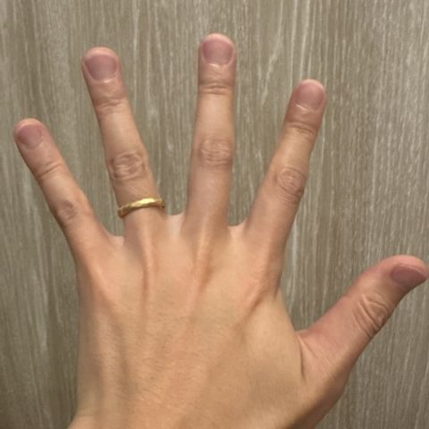 鍛造製法なのでシンプルで丈夫な指輪です。メーカーオリジナルのカラーで肌に馴染むところも気に入っています。夫婦でそれぞれエッジ加工としぼり加工を施し、全く同じではないけれどお揃いに見えるようなデザインにしました。
