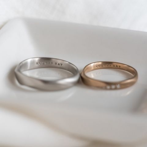 波打ったデザインでピンクゴールドがアクセントになってかわいいです!着け心地もとてもよく、ずっとつけていたいと思える指輪です。 女性側は真ん中にダイヤがあしらわれていて、さりげなく、でも存在感のある雰囲気になります。 男性側はシンプルさもあり、ピンクゴールドの線が一本入っているのがとてもよくお気に入りポイントになります! 裏には刻印とお互いの誕生石を入れることができるのもお気に入りです。