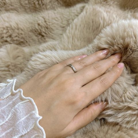 ウェーブになっているリングです。 つけ心地も滑らかな加工になっているので付け外ししやすいです。少し溝がある場所にダイヤも入っているので、さらに輝きを放っています。 付けていてうっとりします。 > 結婚指輪と重ね付けすると気分があがります。