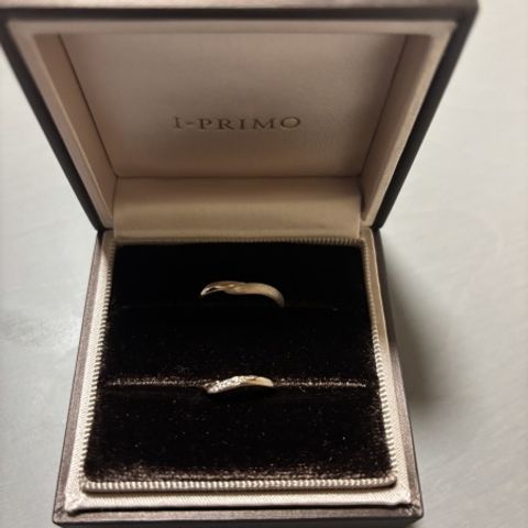 結婚指輪ということで対っぽさを出すために同じプラチナでウェーブデザインにしました。別の所で見たときにダイヤは必須だねとなり私に指輪だけダイヤをつけました!事前に着け心地を知るための入籍指輪もあり安心して結婚指輪をお願いできました。