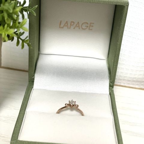 婚約指輪はラパージュのものを選びました。横から見た時のデザインがおとぎ話に出てくる馬車のようで可愛くて一目惚れでした。色もピンクゴールドで肌なじみが良 く特別な日だけじゃなく、毎日つけたくなるようなデザインです。