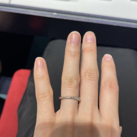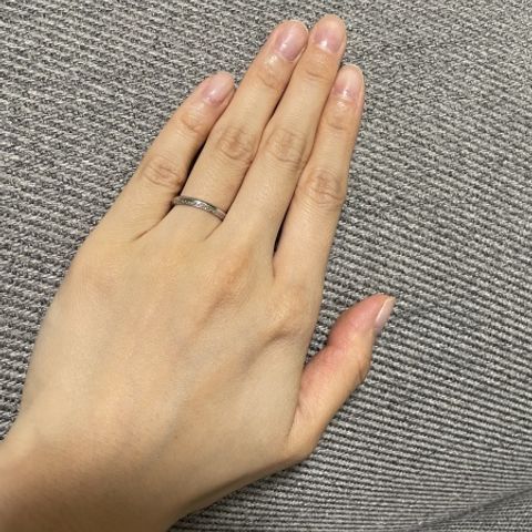 デザインもシンプルなので馴染みがよく気に入ってます お互いが同じデザインで似合うものが良かったので 色々見た結果1番しっくりきた物にしました リングも細めが好みだったのでその点も良かったです 最初はダイヤ無しで検討してたのですが 綺麗な輝きにも関わらず主張しすぎてない所が気に入ってます