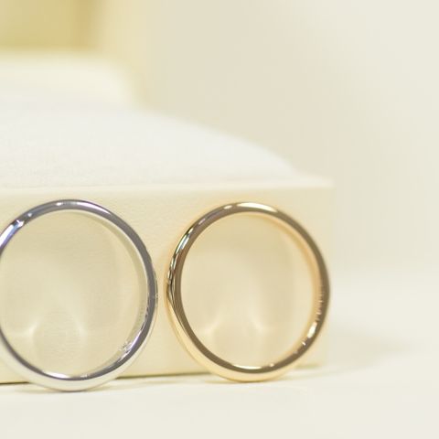 キラキラしたものが苦手でダイヤは付いていないが艶があり綺麗だった。 3層になっていてデザイン性もあるがシンプルでずっと飽きずに付けていられそう。 3色と1色のデザインがあり男性側もデザインがありながらシンプルで良い