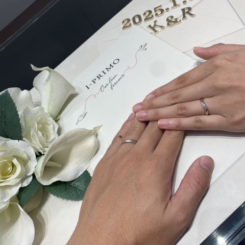 私たちの好みを細かく聞いてくださり、いいとこ取りの指輪をデザインしていただきました。ウェーブの形や1つの石から2つ取れるダイヤをつけるなどお揃いのデザインがとても気に入っています。2人とも指輪を外すことも多いということで、2つ重ねて置いた時にハートができるデザインにしていただけたのも嬉しいです。