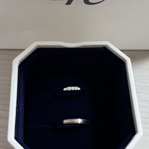 女性は少し細目のS字型 ダイヤ7石のシンプル、プラチナ素材 とっても可愛く着け心地がいい指輪 男性は少し太めシンプル、プラチナ素材 セミオーダーで試着や説明を伺いながらのオーダー。 結婚指輪で好みが違うので形や細さではないものの、指輪の裏に刻印が出来き共有する事が出来る良さがあります。