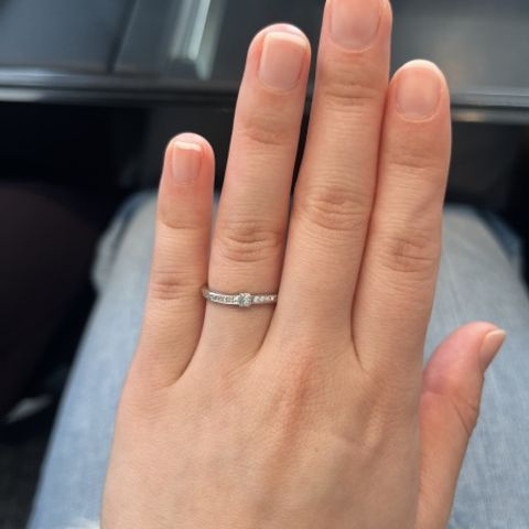 ゆるやかに曲線がついていて、主張しすぎないダイヤがさりげなく輝くデザインがとても好みで購入しました。またほかのブランドの指輪と比べてダントツに着け心地がよく、なじみよくずっとつけてられる感じが気に入りました。