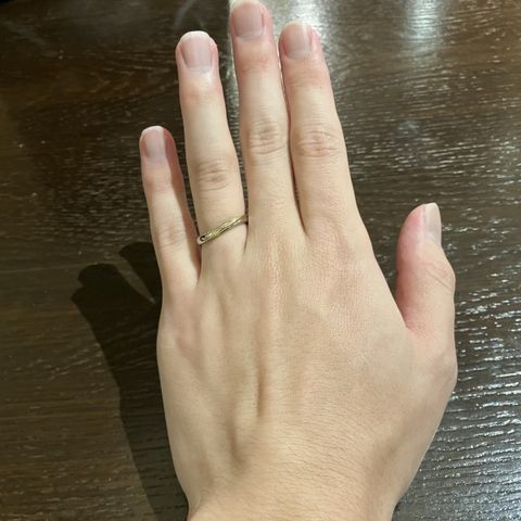 シンプルすぎるかつ派手な指輪はあまり考えておらず 2人にお似合いですよと進めてくれたのがアルチュステの指輪でした。私の指輪の色はピンクゴールドにしてもらい曲線が入って小さなキラキラが入っていてつけてみたらとても指には馴染んでかわいかったです!