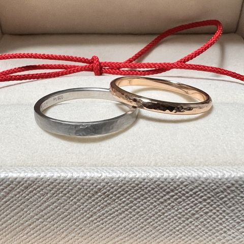 初めの店内で素材やデザインを選ぶ時間も丁寧に対応して頂いて決めました ムチムチな指だけど肌なじみのいいピンクゴールドにしました! 旦那さんはプラチナで色と形は違うけど加工は同じものに! 2人でトントンかんかんしてお気に入りの指輪に仕上がりました!