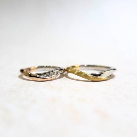 お互い指輪にこだわりがなかったため、ブランド品より作って唯一無二のものにしようと作成しました。普段付のできるようにプラチナとピンクゴールドと、お互い好きなものを選び内側には名前と誕生石を入れてひっそりペアとベターなことをしてみました。
