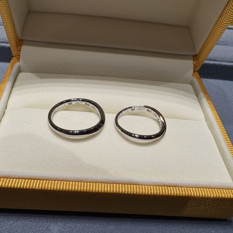 指輪の素材はプラチナ950でしっかりしていて、きらめくデザインに惹かれました♪ 甲丸リングを探していて、店舗のスタッフさんとつけ比べしながら思っていたものと出会うことができました。 彼はペアデザインではありませんが、マットの部分がとても気に入り、オリジナルのペアでと考えています