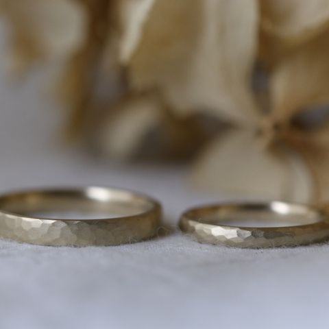 指輪の付ける向きによって、鏡面仕上げ、マット加工、槌目加工の組み合わせを選べるようにしました。なので、フォーマルな場所では鏡面にして、カジュアルな場所ではマット加工、槌目加工の両方が見えるように等、二人で話しながらこだわって指輪を決めました。