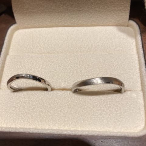 デザインはこだわりを全て詰めたオリジナルデザインです!S字カーブは指の長さを強調してくれます。ラインはウェーブで入れて、2人のマット加工は少し違うものになっています。マット加工の素材もいろんな素材からお互いが気に入るものを入れました!内側の刻印もお互いの誕生石を入れてこだわりが詰まっています。