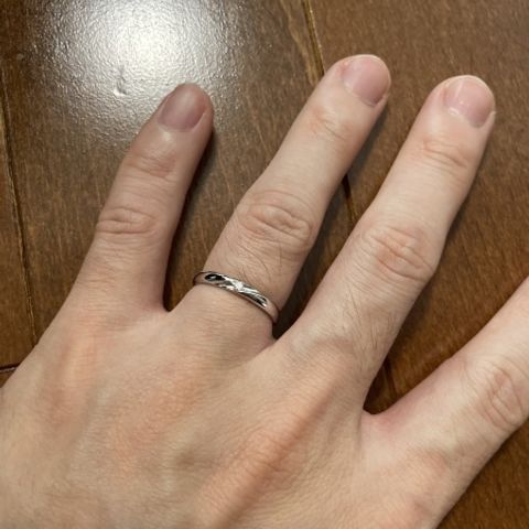 ダイヤは入れる希望がないけれど、輝きは欲しいと話したところ、スターダスト加工を勧めていただきました。スターダスト加工は経年劣化しやすいものの、鍛造製法だからこそ、輝きを維持できるとのことです。ふたりでお揃い感が出て嬉しいです。