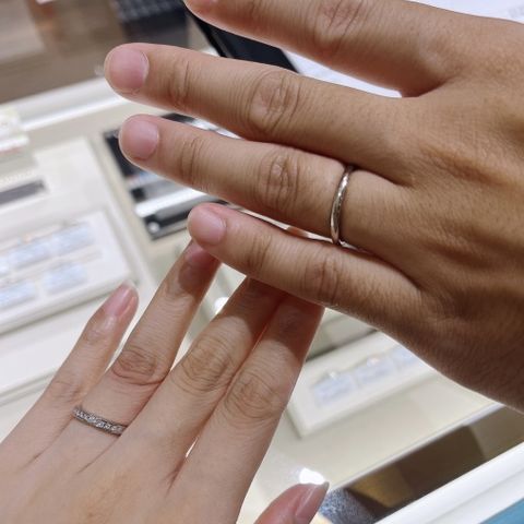 サイトでいくつか目星をつけて来店しました。実際につけてみて男女ともに細めがよくてセットリングから選びました。メンズはゴールドで中心を艶消し加工しました。着け心地も良くて普段つけても違和感なく、凄く凄く良かったです。