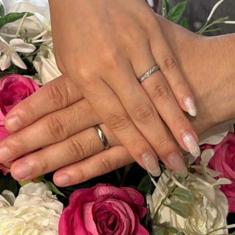 毎日つける結婚指輪はシンプルなデザインがいいと思っていたため、来店するまでは、購入した指輪のデザインは候補に入っていませんでしたが、来店した際にスタッフの方が丁寧に色々なデザインの指輪を紹介してくださり、実際購入した結婚指輪に出会うことができました。付け心地も良く、私の方はツルツルしたデザインにダイアモンドを1pc、夫の方はヘアーラインが入ったデザインにし、お互いの指輪に統一感もあり、非常に気に入っています。