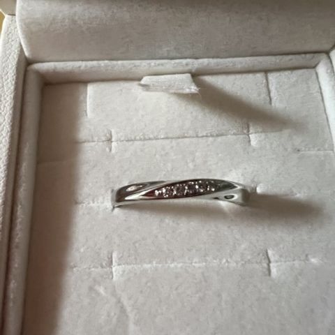 普段使い出来るようなデザインながらも華やかさもあり、つけていて気分が上がるような指輪だなと思いました。ダイヤモンドが複数付いていますが、極端に派手にもなっておらず、かといって控えめすぎることもなく、とても素敵なデザインです。