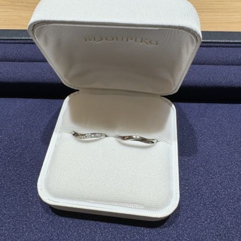 真ん中の部分がウェーブになっていて、ダイヤモンドが入っていなくても光を当てた時にキラキラと輝くところが気に入っています。 お互いに好きなデザインを選んだため、彼女とペアリングではありませんが、どちらのデザインもウェーブが入っているデザインで、さりげなくペア感が出るところがよかったです。