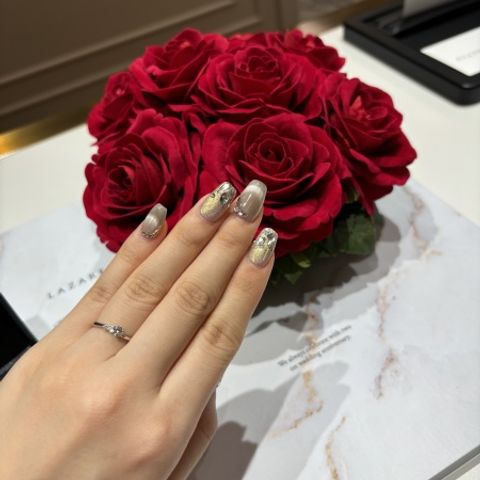 派手すぎず、一方でどの角度からもダイヤがキラッと見える華やかさもあり、 つけて嬉しくなる指輪だと思いました。 初めはダイヤがもう少し少ないデザインを選んでいたのですが、諦めきれず再度訪問してこちらのデザインに変更しました!満足です!
