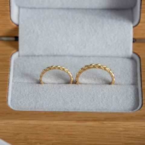 初めての結婚指輪購入という事で、風結を購入しました。出雲大社のしめ縄をイメージしているという事で、緩やかなカーブのかかった指輪です。 私はカーブのラインを着用時に目立たせたかったのでカーブのライン以外をオプションでマット加工にしました。 それもあり、とても着用時にラインが目立ちより綺麗な仕上がりでした。