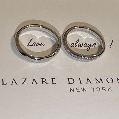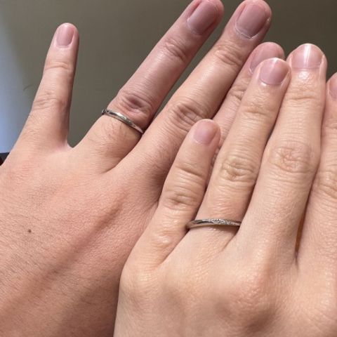 ダイヤモンドがキラキラしていて可愛いです。私のは程よくウェーブが入っていて指の形にフィットして、着け心地がとても良いです。彼のは、一部艶消しをされているデザインで、とてもお洒落です。ペアでは買わずにお互いに好きなデザインで選べてよかったです。