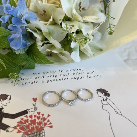 金とプラチナが両方入っていて、飽きのないようなデザインにしました。もともと女性の方にだけダイヤが5つ入っているものでしたが、指輪自体の存在感が強くエレガントすぎて私の普段の服装には合わないのではないかと相談させていただいたところ、ひとつのダイヤを2つに分けて1つずつ入れることができるとおすすめしていただき、夫の指輪にも1つダイヤを入れました。ダイヤは1つなら控えめなので男性の指輪にも入れてもいいなと思いました。 夫の指輪の金の部分に艶消しをかけたのですが、それがとても気に入っているようです。艶消しがあるとキラキラしすぎなくて男らしさを感じることができます。大人っぽい落ち着いた雰囲気も出ておしゃれだと思います。
