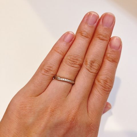 軽やかなつけ心地を何より大変気に入っております。婚約指輪との重ね付けで、改めてご提案くださって、時間掛けて選ばせて頂きました。デザインもシャープでシックなので婚約指輪との相性も大変気に入っております。また、クリーニング、メンテンス、後々の事も含めての安心感も、長いお付き合いにおいて有り難く思っております。