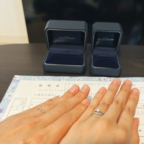 結婚指輪と婚約指輪で同じブランドにしました。そのおかげで、一緒につけてても違和感が無くつけることができます!結婚指輪もダイヤモンドをあしらったものにしたので婚約指輪は高さがあって一緒に綺麗につけれるようにしました!