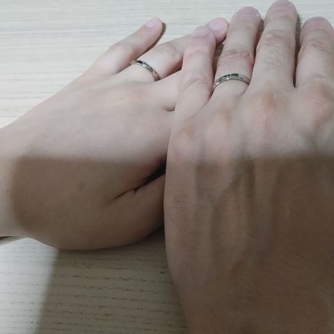 私はキラキラしすぎないけど少しポイントが欲しいという点、旦那はシンプルがいいという点で迷うことなく決まった指輪でした。 シンプルの中にもポイントがあるのが嬉しいです。 2人のイニシャルを入れようと思いましたが 文字数オーバーだったため、 そういう場合のパターンを教えていただき 私の指輪には旦那の名前、旦那の指輪には私の名前を刻印していただきました。