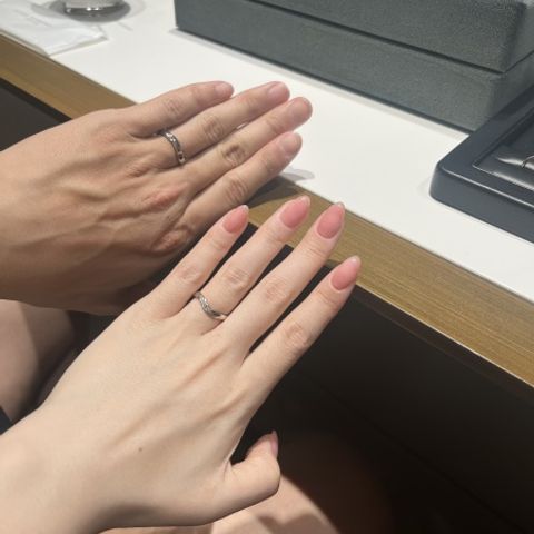 婚約指輪と結婚指輪を同ブランドで揃えたので親和性がかなりいいです!他ブランドの結婚指輪と重ね付けしたときを比べると輝きが増す気がします! また、細すぎもせず太すぎもせず華奢な指ではないためとてもよいサイズ感だと思います。新郎の指輪デザインも他ブランドと比べると選択肢がかなりあると思います!