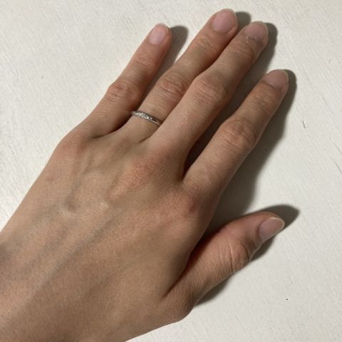 まず店舗に行く前にネットで見て、気になったのが2つありました。私は付けてる感じがするものが良かったのですが旦那には細めのほうが指きれいにみ゙えるんじゃないと言われ、何個も付けさせてもらいましたがネットで見ていたうちの1つが自分に合っていました。