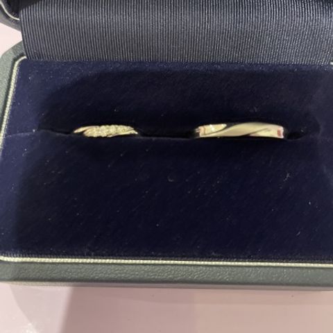 デザインがシンプルなのに綺麗で着け心地がとてもよいです。1番最初に自分達の系統と手や指の診断をしていただいたので、自分達の手や雰囲気にしっくりくる指輪が見つかりました。婚約指輪との重ね付けもできるのでとても満足しています。