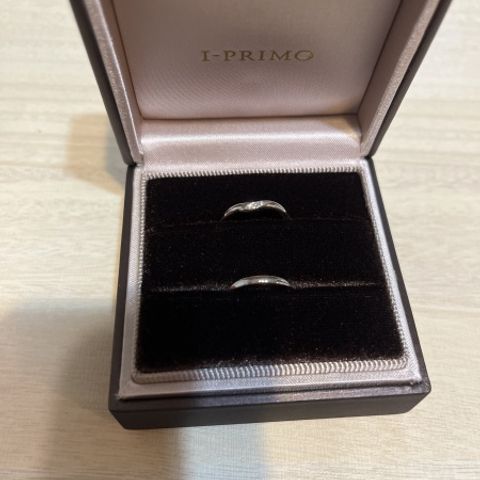ダイヤモンドが完全に埋まっているタイプではなく、少し飛び出ているところが気に入っています。ダイヤモンドが立体的であり、光に当てた時の輝きが目をひきます。新郎用もウェーブが綺麗で、ねじれたスタイルがポイントと思います。