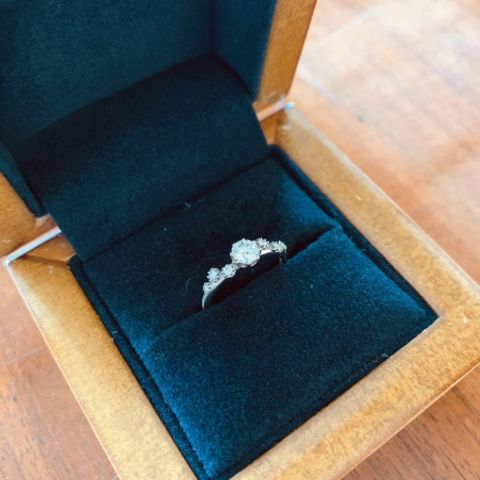 ひとつの大きなダイヤモンドを囲んでるメレダイヤモンドがシンプルなデザインながら、ゴージャスに見えるデザイン性がとても魅力的だった。どの角度からみてもキラキラと輝いて見え、婚約したんだなと実感することができます。