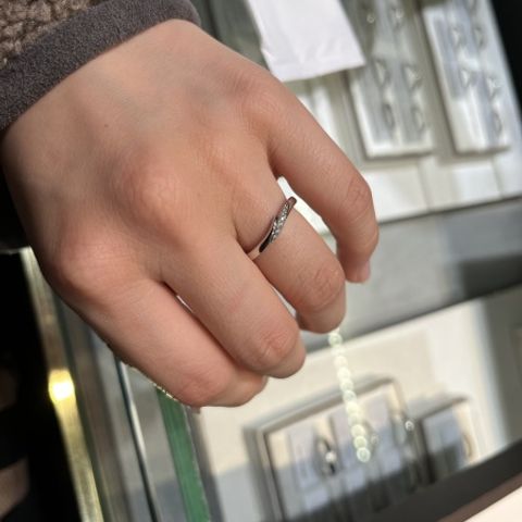 何種類か出していただいて実際つけさせてもらって形も見た目も価格も理想どおり。派手すぎず華奢すぎずダイヤがさりげなく輝いていてお気に入りです。V字になっているからいつもより指が細く見えるのも気に入ってます。