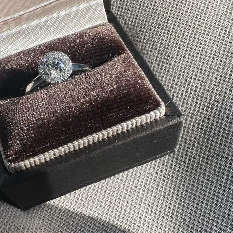 ひとつの大きなダイヤモンドを囲んでるメレダイヤモンドがシンプルなデザインながら、ゴージャスに見えるデザイン性がとても魅力的だった。どの角度からみてもキラキラと輝いて見え、婚約したんだなと実感することができます。