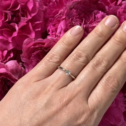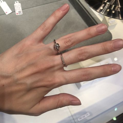 結婚指輪と重ね付けが出来るものを探していたので、この形を選びました。 とてもシンプルで重ね付けしやすいです。 一粒のダイヤがメインのデザインなので、大きさによって雰囲気がかわります。結婚指輪と重ねてつけた時の雰囲気が1番気に入った大きさのダイヤを選びました。